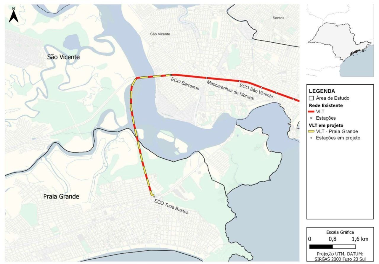 Trata-se de um percurso de aproximadamente 5,3 km e, segundo o ENMU, não há maiores informações sobre estações previstas. O trecho promoverá a ligação entre o Terminal Barreiros, em São Vicente, e o Terminal Tude Bastos, em Praia Grande, saindo da Avenida Angelina Pretti da Silva, em São Vicente; com trecho aéreo e passando por faixa inabitada, seguindo pela Rua José Bonifácio, no Bairro Sítio do Campo, até chegar e se integrar com o Terminal Tude Bastos, integrando-se ao sistema municipal de Praia Grande e com o BRT, previsto também com operação neste terminal.