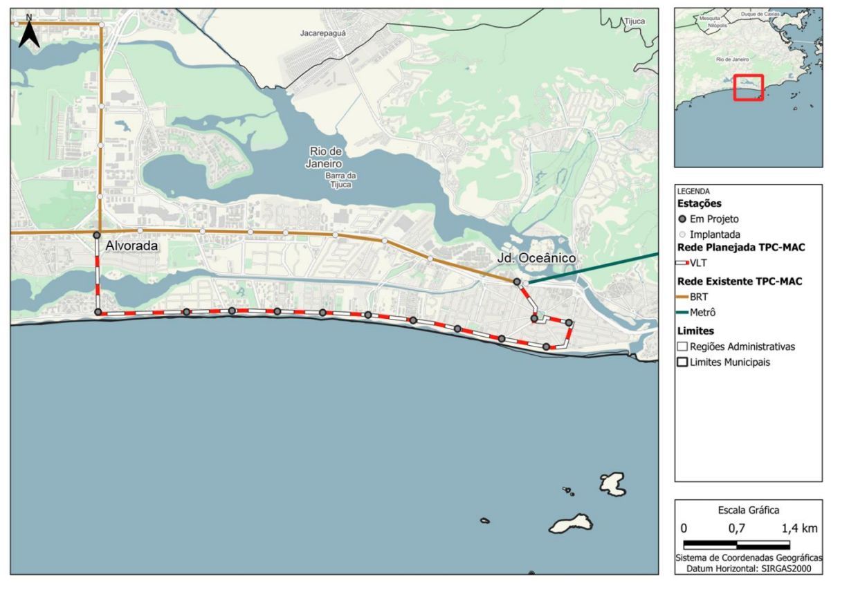 Já sobre o eixo 13, o traçado de 8,9 quilômetros previsto para o novo VLT seguiria pela Avenida Lúcio Costa, paralelamente à Avenida das Américas, onde já opera o corredor de BRT. Apesar da sobreposição geográfica com o sistema existente, o projeto foi mantido na rede planejada para avaliação dos impactos e de possíveis integrações entre os modais.