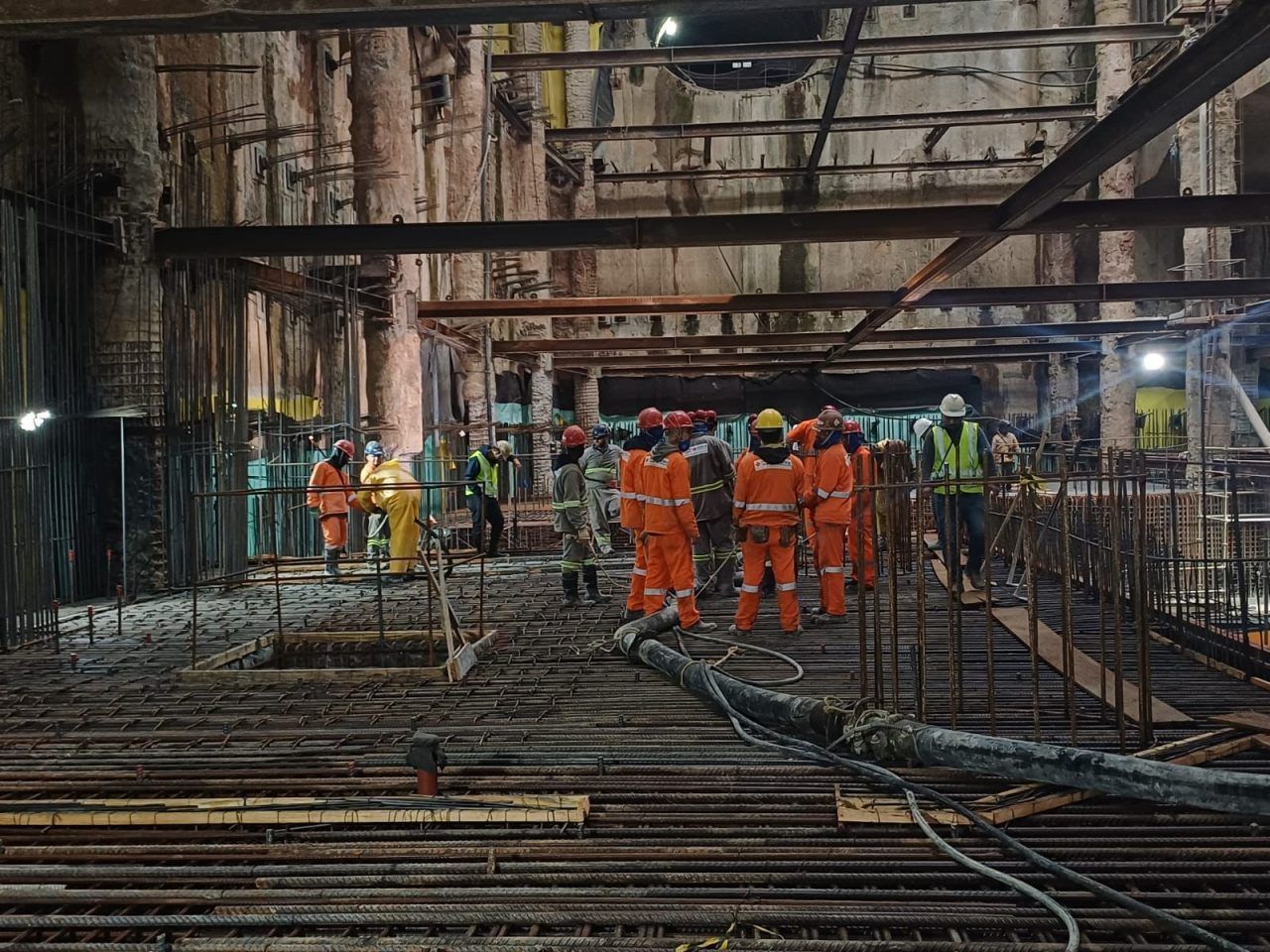 Na quarta-feira (13), a concretagem na Estação Santa Isabel — que já atingiu 71% de avanço físico — teve início às 6h e seguiu até as 17h. O trabalho foi realizado na laje de arraste do túnel norte e demandou cerca de 255 m³ de concreto, lançados ininterruptamente por 32 betoneiras.