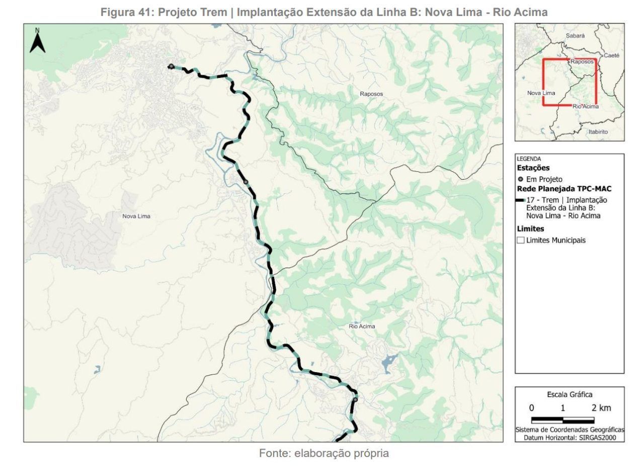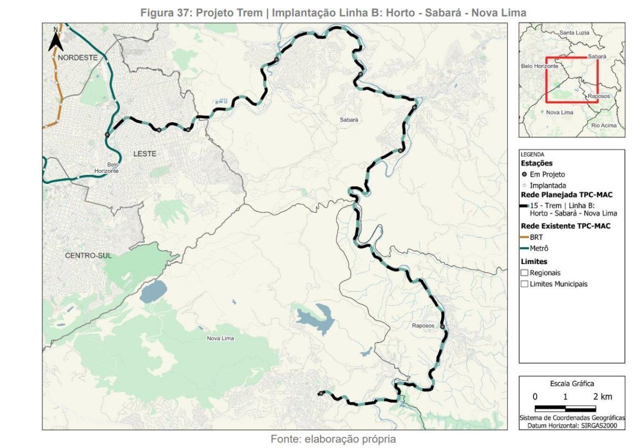 O Estudo Nacional de Mobilidade Urbana (ENMU), elaborado pelo BNDES em parceria com o Ministério das Cidades, detalha os projetos de expansão ferroviária previstos para a Região Metropolitana de Belo Horizonte (RMBH). Entre as propostas está a Linha B, que ligará as regiões leste e sudeste da capital mineira, conectando Horto, Sabará, Nova Lima, Caeté e Rio Acima.