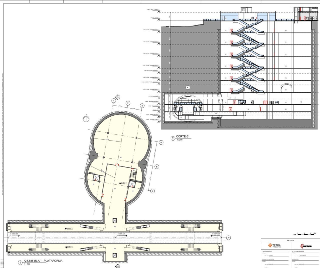 O projeto prevê seis pavimentos intermediários entre o acesso e as plataformas, garantindo fluidez na circulação dos passageiros. Todos os níveis serão conectados por elevador, escadas rolantes e escadas fixas, assegurando acessibilidade total. O mezanino inferior, situado na cota 729,05, concentrará as bilheterias, bloqueios de acesso e a Sala de Supervisão Operacional (SSO), responsável pelo monitoramento das atividades e segurança.