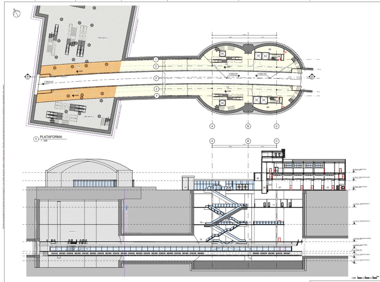 A estação terá duas plataformas laterais, com 6 metros de largura e 132 metros de extensão, dimensionadas para suportar tanto as condições normais de operação quanto situações de maior demanda. Entre o nível da bilheteria (cota 748,51) e a plataforma (cota 716,67), haverá dois pavimentos intermediários e um mezanino inferior (cota 721,63), que organizará os fluxos de entrada e saída, especialmente nos horários de pico.
