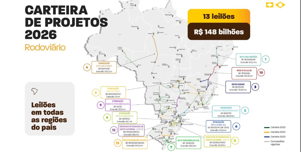 Desde o início da atual gestão, o Ministério dos Transportes já promoveu 21 leilões rodoviários, somando 10.009 quilômetros concedidos e R$ 232 bilhões contratados. Para 2026, estão previstos 13 novos leilões, com potencial de atrair outros R$ 148 bilhões.