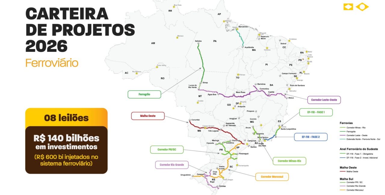 A carteira de projetos para 2026 inclui oito leilões ferroviários que somam mais de 9 mil quilômetros de extensão. A expectativa é de que os certames atraiam aproximadamente R$ 140 bilhões em investimentos, com potencial de alcançar R$ 600 bilhões ao longo dos contratos. A ampliação da malha deve reduzir custos logísticos, aumentar a competitividade do setor produtivo e diminuir a dependência do transporte rodoviário.