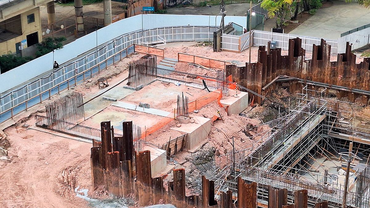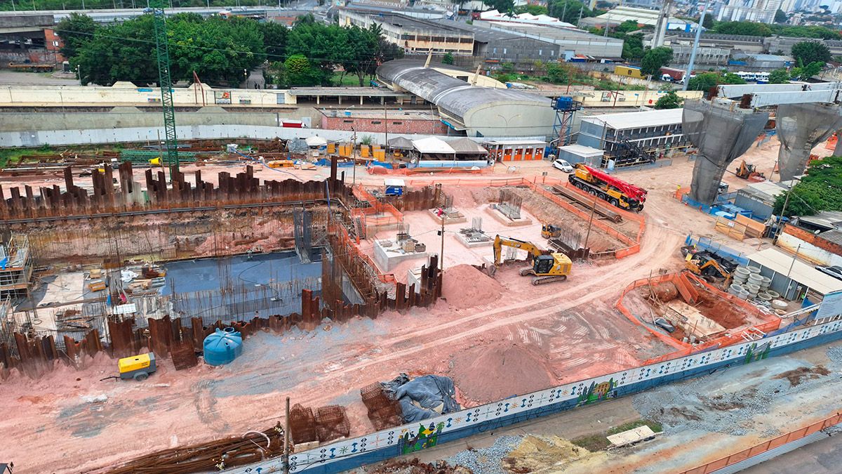 Ao norte da estação, ocorre o associamento dos blocos de fundação, com frentes simultâneas trabalhando na estabilização e preparação da base estrutural. Já os blocos de fundação localizados ao sul aguardam a etapa de concretagem, prevista para os próximos dias, permitindo o avanço equilibrado entre os dois lados.