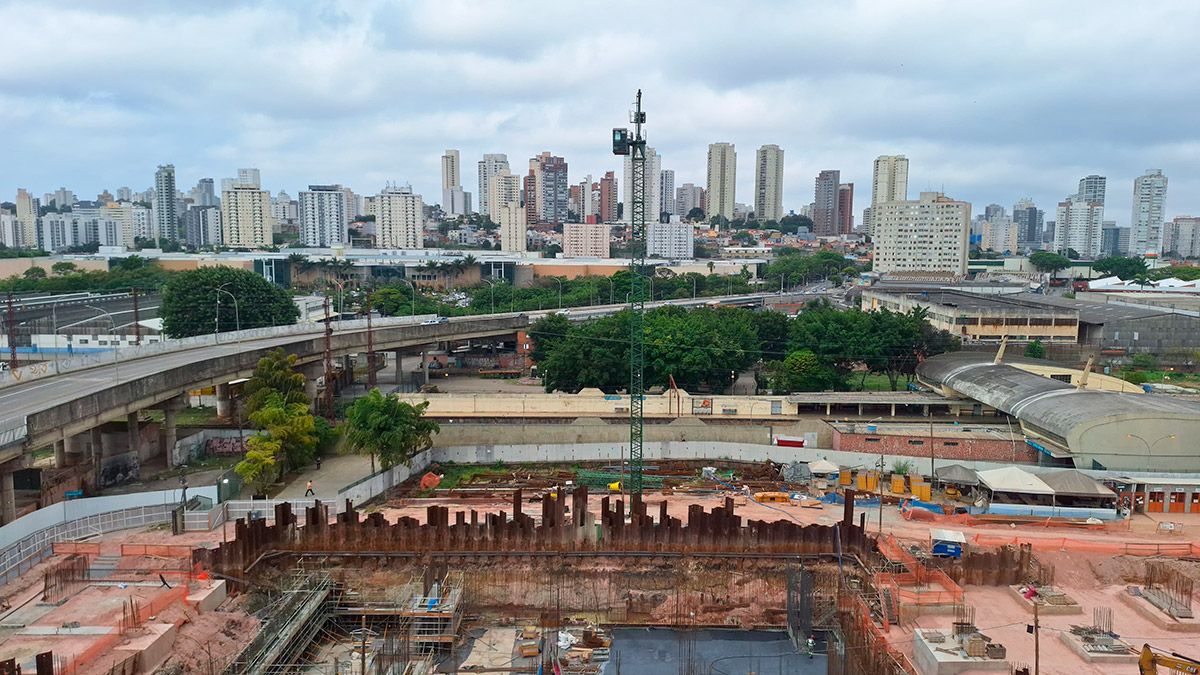 As obras da futura estação Ipiranga da Linha 15-Prata avançam em diferentes frentes ao longo da Avenida Presidente Wilson e da região próxima ao Viaduto Pacheco e Chaves, onde será implantada a área de manobra do monotrilho.