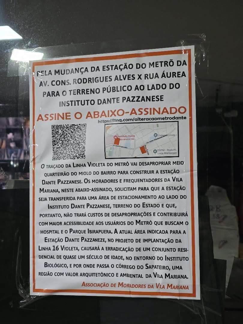 Um abaixo-assinado atribuído a uma associação de moradores da Vila Mariana pede a mudança do local de uma futura estação de metrô. Segundo apurou o Via Trolebus, cartazes que divulgam a iniciativa estão sendo distribuídos em condomínios localizados na região da futura estação Dante Pazzanese, da Linha 16-Violeta.
