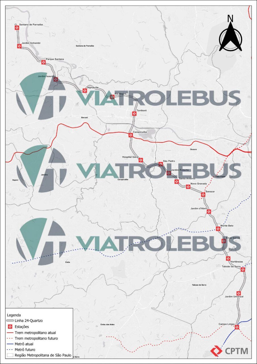 No primeiro artigo falamos sobre o tramo norte e a Linha 26-Ametista, e no segundo artigo da série sobre o tema, o Via Trolebus aborda o tramo oeste, correspondente à Linha 24-Quartzo, que ligará a capital paulista a cidades que hoje não contam com transporte ferroviário, como Santana de Parnaíba e Taboão da Serra.