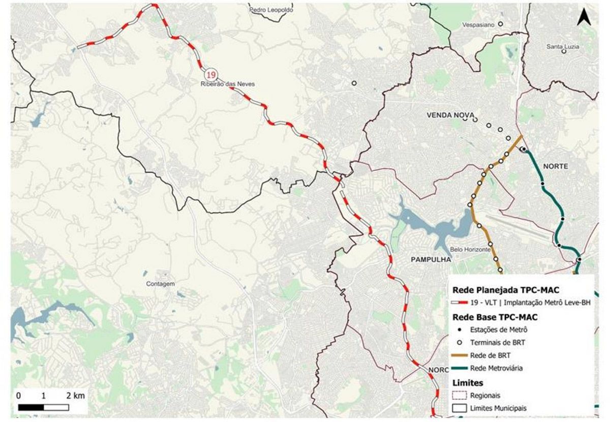 O planejamento projeta a introdução de sistemas ferroviários de média capacidade para oferecer alternativas de alta tecnologia e eficiência energética. Um dos projetos centrais é o Metrô Leve-BH, planejado para conectar o bairro Padre Eustáquio, na região Noroeste da capital, ao município de Ribeirão das Neves. O traçado proposto possui extensão aproximada de 11,5 km e deve percorrer vias estratégicas como a Avenida Dom Pedro II e a Avenida Tancredo Neves, integrando-se à rodovia LMG-806. Atualmente em fase de anteprojeto, a estimativa de entrega para esta infraestrutura é o horizonte de 2042.