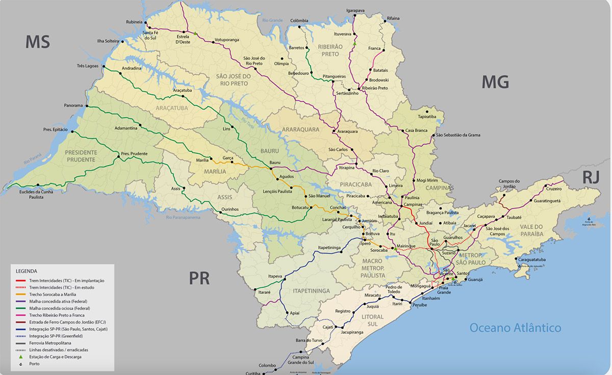 Entre as ligações previstas estão o trecho entre a Baixada Santista e Curitiba, além de uma conexão entre Sorocaba e Marília. Outro trajeto descrito no mapa compreende o eixo entre Ribeirão Preto e Franca, passando por Brodowski e Batatais.