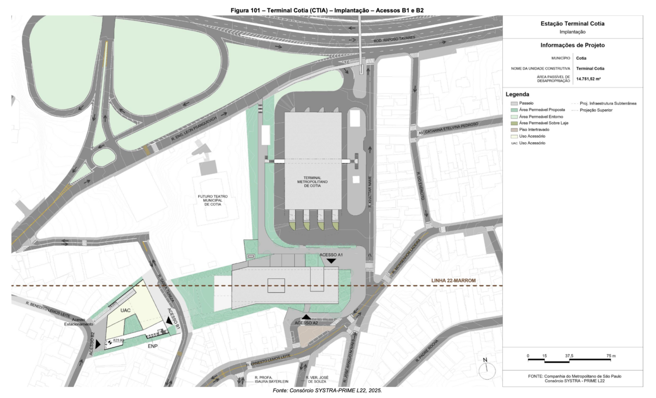 Um dos documentos detalha a implantação da estação Terminal Cotia (CTIA), que será o ponto final da segunda fase do ramal. A futura parada será construída estrategicamente ao lado do atual terminal metropolitano, conectando o sistema sobre trilhos diretamente ao centro do município. As informações contidas no documento público são preliminares, e o projeto não está na fase de desapropriação.