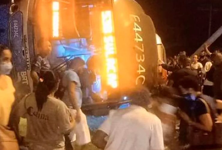 Um ônibus articulado que operava no sistema BRT tombou na Avenida das Américas, na altura de Guaratiba, Zona Oeste do Rio de Janeiro, na noite desta quarta-feira, 10 de março de 2021. Uma pessoa acabou morrendo no local, segundo o ...