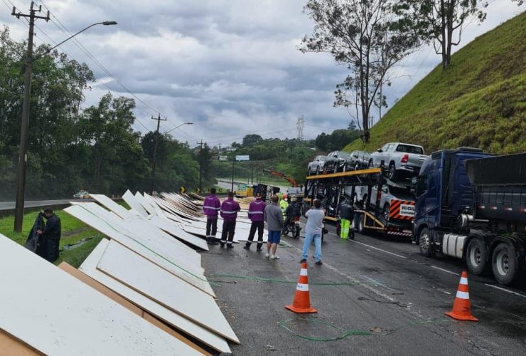 Por volta das 06h20 da manhã, uma carreta tombou com derramamento de carga no km 290,3 da Rodovia Régis Bittencourt, em Itapecerica da Serra, no sentido de São Paulo. De acordo com a concessionária Arteris, as faixas da esquerda e ...