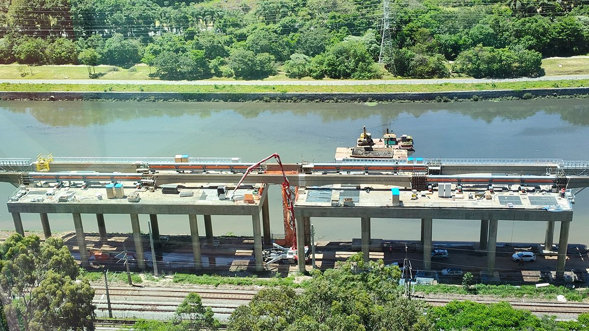As peças do track switch da Linha 17-Ouro, instalado na Marginal Pinheiros, já foram posicionadas e o local segue agora para a etapa de concretagem. Em um dos lados da estrutura, o concreto já foi aplicado; no outro, operários preparam ...