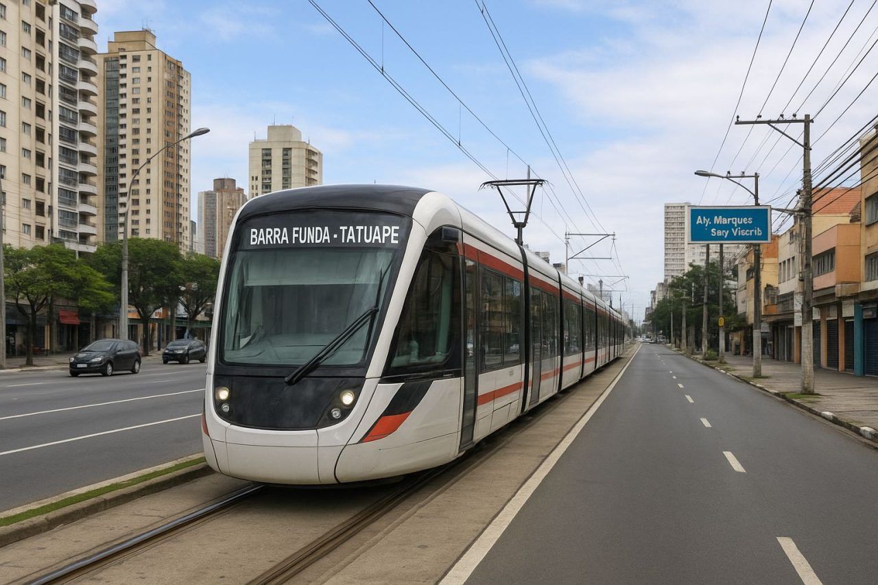 Um corredor verde que pode abrigar um veículo leve, seja sobre trilhos ou sobre pneus, ligando as zonas leste e oeste de São Paulo. Calçadas largas, junto com um parque linear de modo a privilegiar o pedestre, além de uma ...