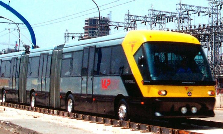 Um trólebus biarticulado com guiagem automática em testes em pistas com cerca de 1 quilômetro. A cena foi vista na década de 90 em Interlagos e na Avenida dos Estados, entre o Parque dom Pedro II e o Cambuci. Tratam-se ...