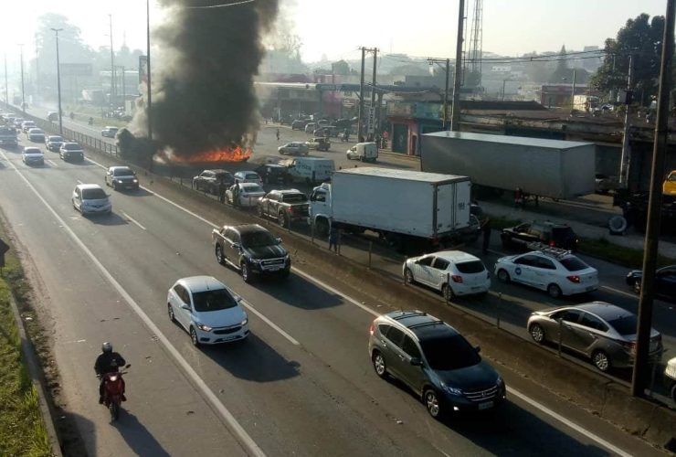 Um grupo de manifestantes contra o governo Bolsonaro bloqueou a pista no sentido de São Paulo da Rodovia Régis Bittencourt, no km 273,9, em Taboão da Serra, na manhã desta quarta-feira, 18 de agosto de 2021. De acordo com a ...