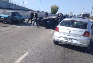 Um acidente envolvendo dois carros, sendo que um deles capotou, ...